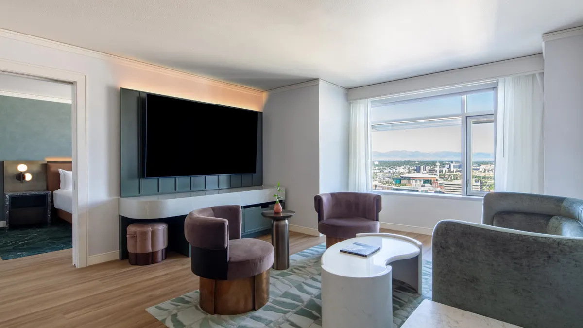 Guest rooms incorporate materials “inspired by the textures of the Rockies and the city’s urban charm,” with warm, refined furnishings and soft green accents, according to the release. Rooms were modernized to include functional under-TV storage, USB-C ports, enhanced lighting and spacious work areas, while updated bathrooms include illuminated mirrors and new bathtubs. Some rooms also feature lounge seating with city and mountain views.